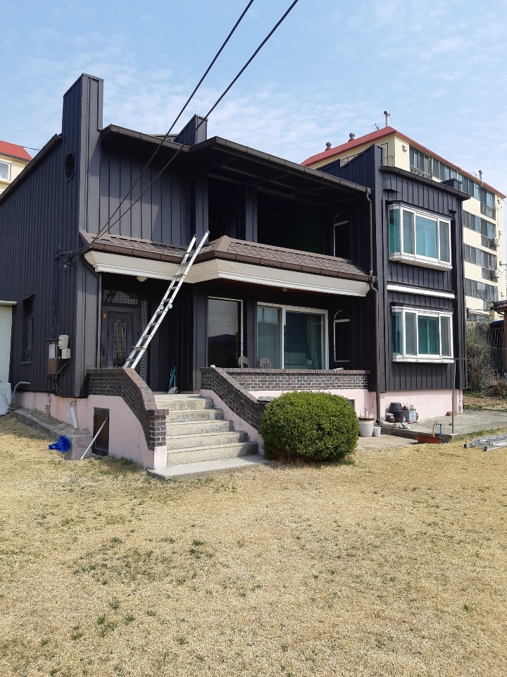 인천시 강화군 관청리.슬라브지붕을 칼라강판 평기와골로 씌우고 V-250징크로 외벽공사한 사례.