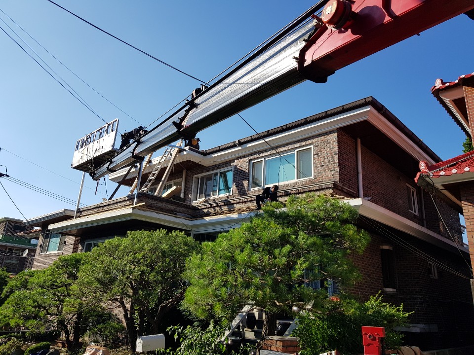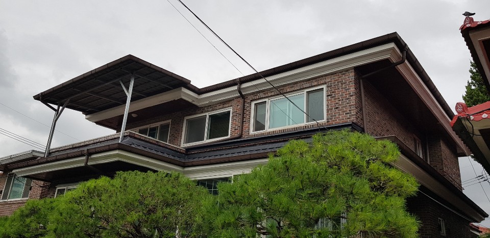 과천시 별양동. 기와지붕과 데스리공사 및 슬라브위 아연각관으로 캐노피공사
