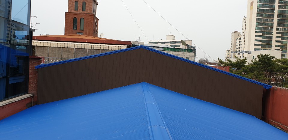 서울시 광진구 군자동 송정교회. 노후된 판넬지붕과 벽체를 내구성 강한 슬레이트골 칼라강판으로 개량공사