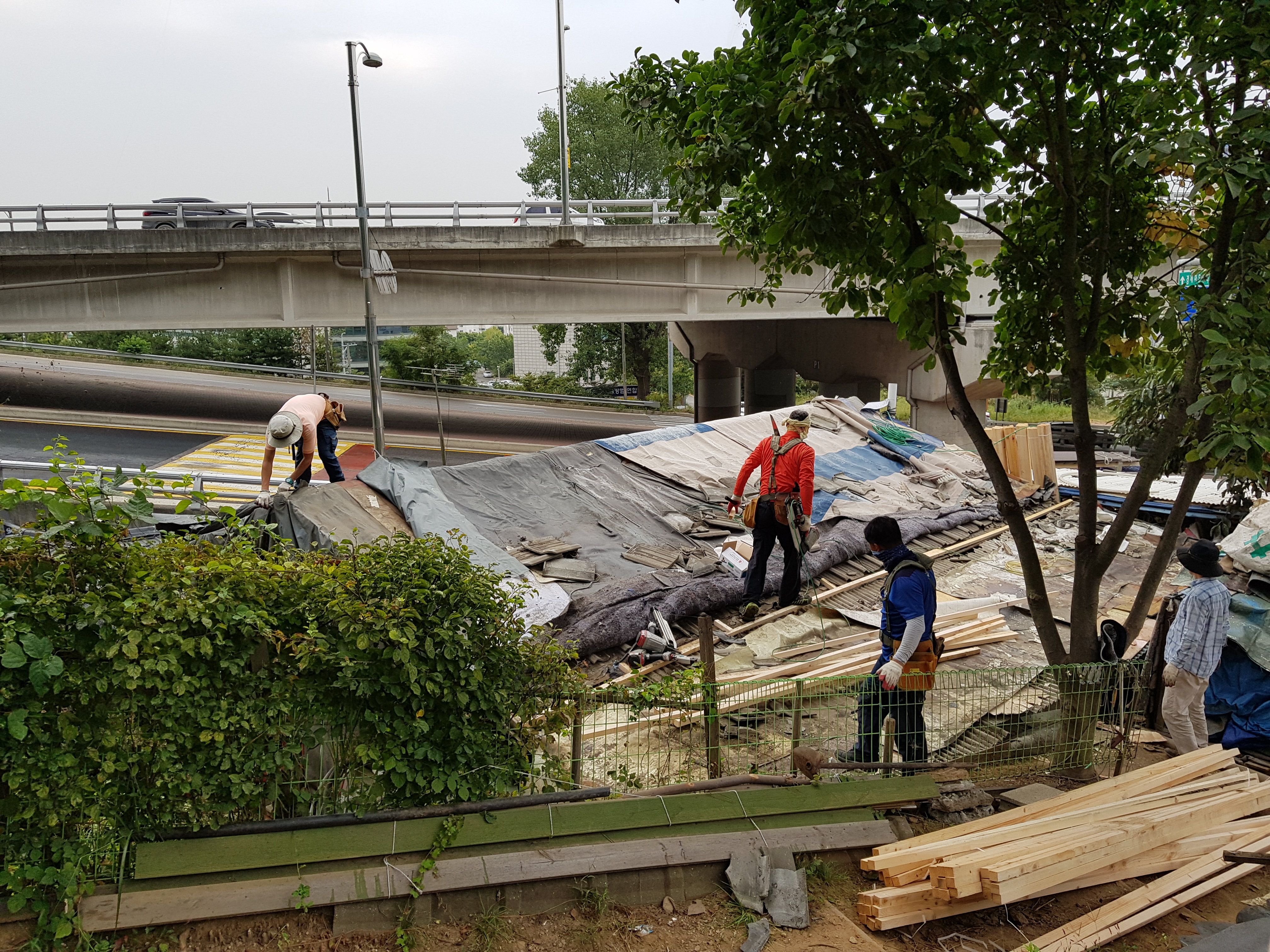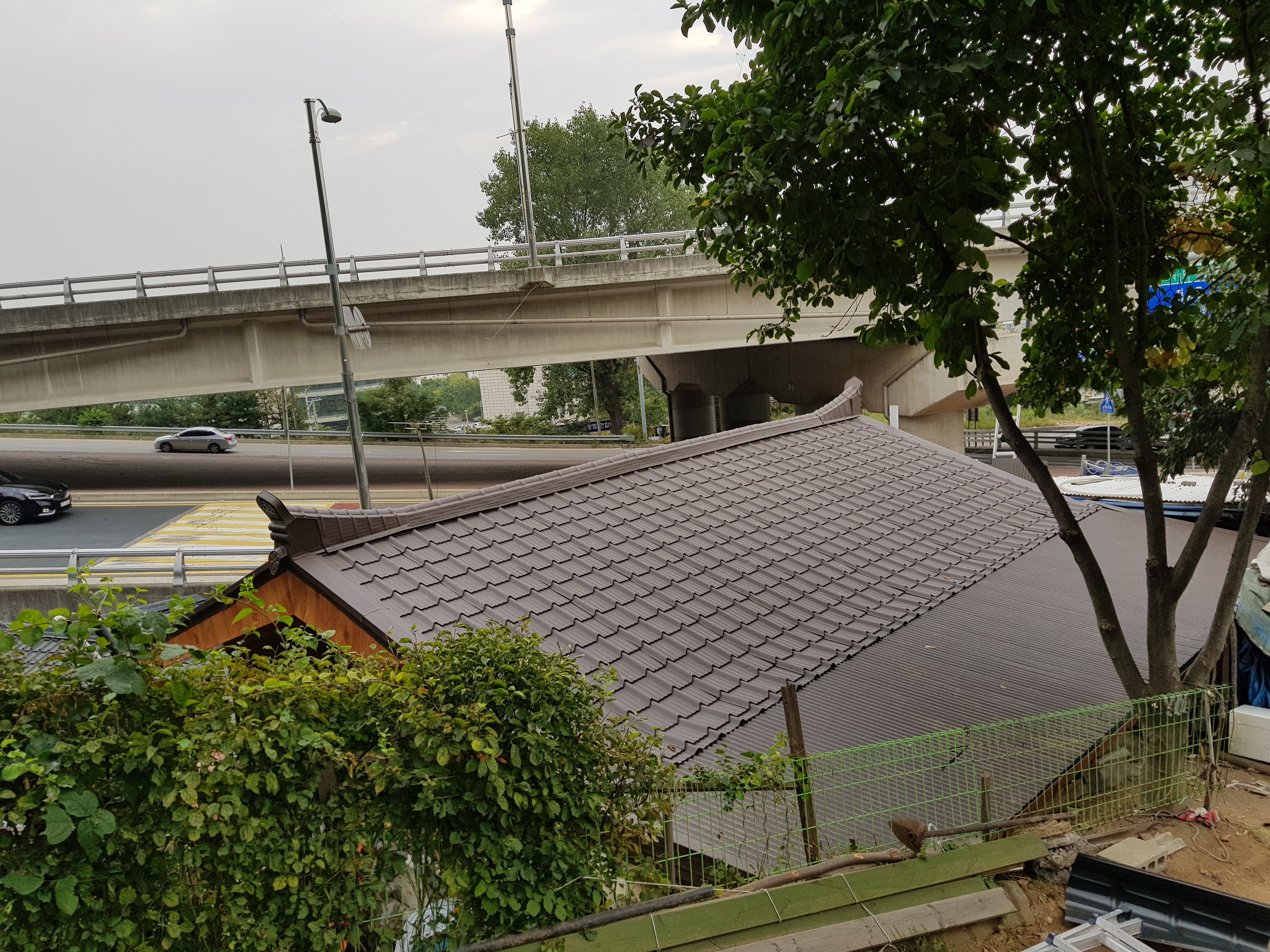 인천 동춘동에 위치한 기와집으로 비가 새지만 재개발로 인해 차일피일 미루며 천막으로 덮고 생활하다 더이상 미룰수 없어 이번에 칼라강판으로 깔끔하게 지붕개량