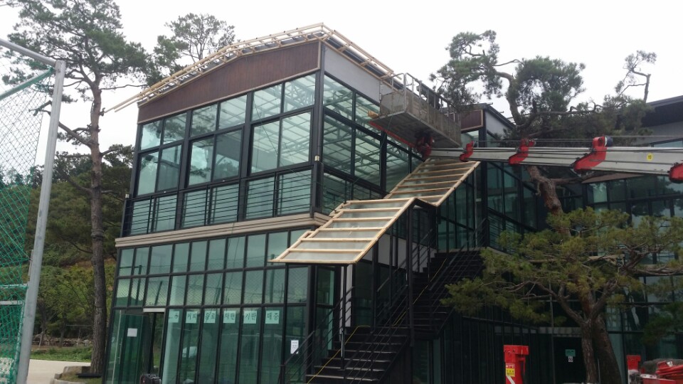 의왕시 포일동 축구장내 별관의 렉산지붕을 칼라강판으로 개량하고 처마를 늘려서 댄조작업한 사례