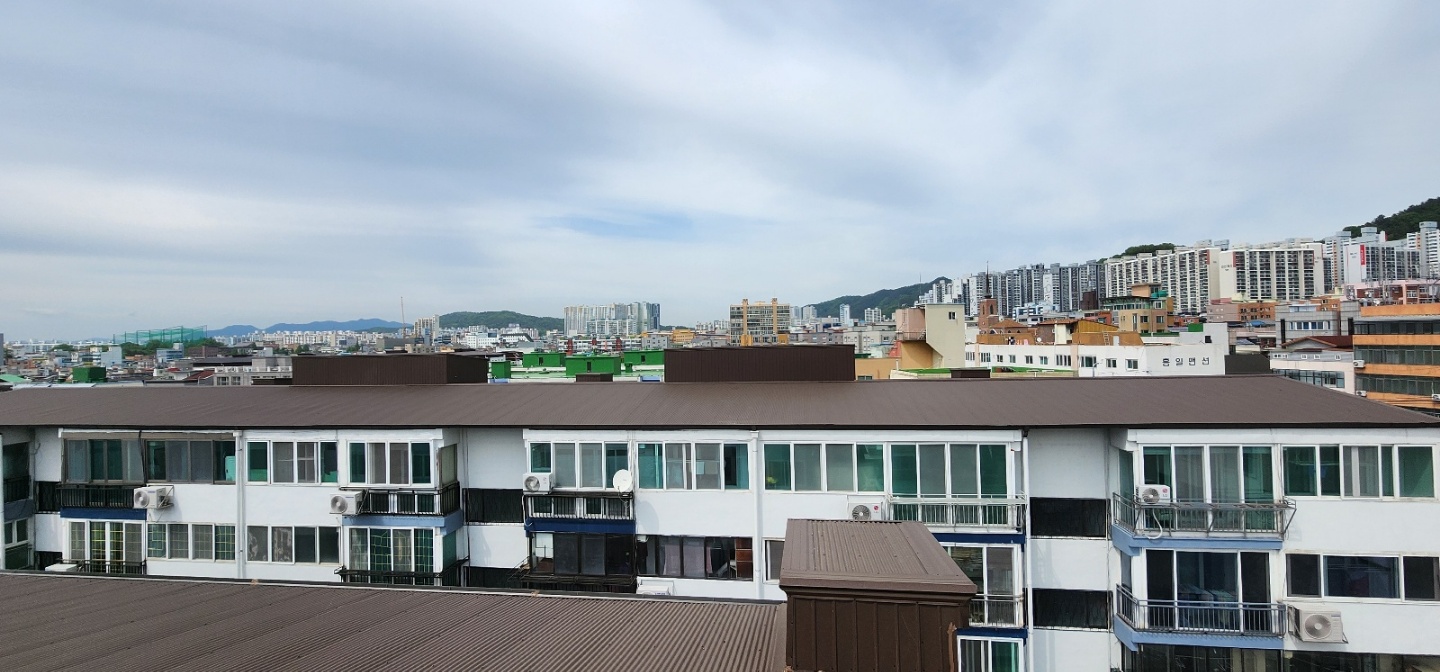 광주시 두암동에 위치한 아파트로, 옥상 슬라브 바닥의 누수로, 칼라강판 슬레이트골로 개량공사함.