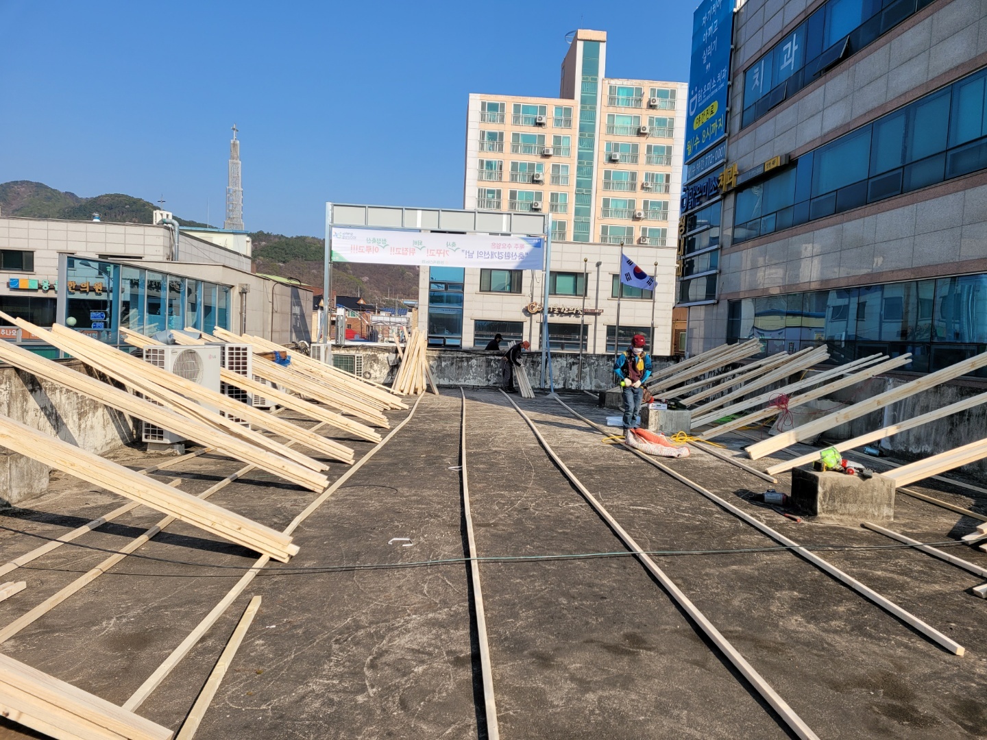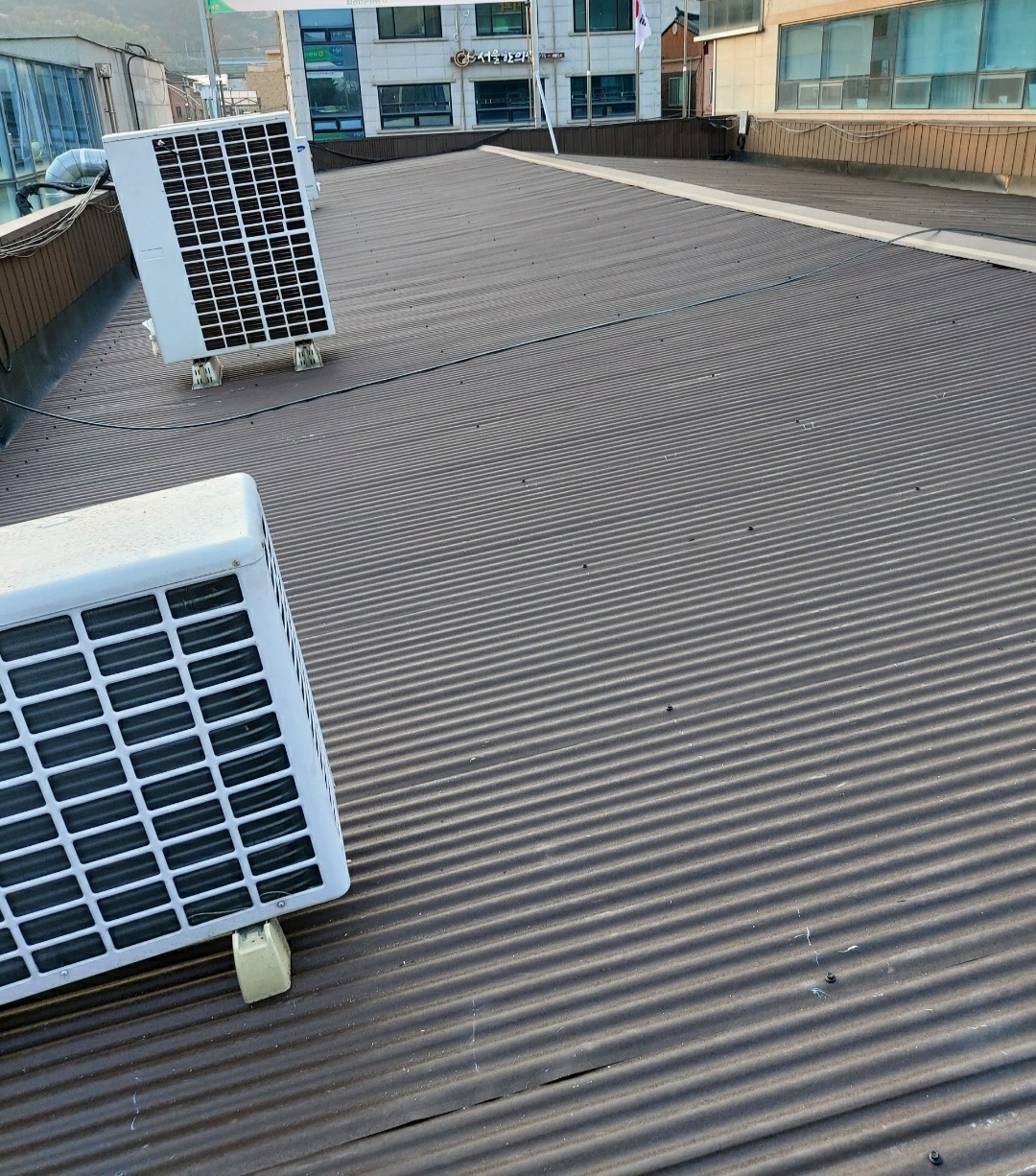 양평군 용문면 용문로. 양평축산농협의 슬라브지붕을 아연도칼라강판 슬레이트골로 옥상활용이 가능하도록 바닥시트형으로 시공함.