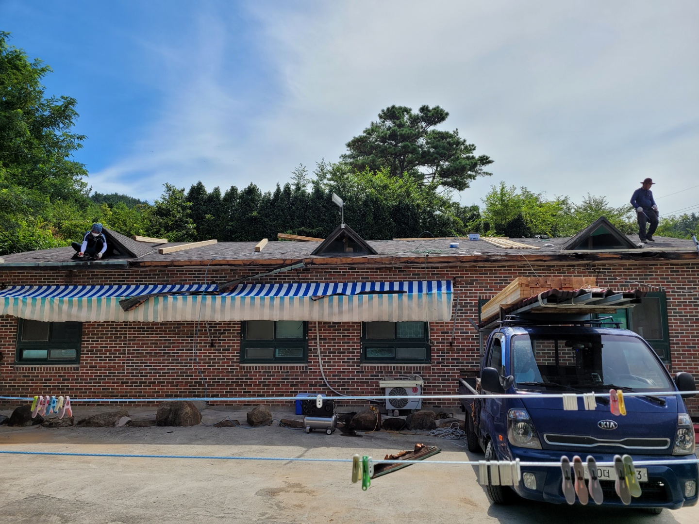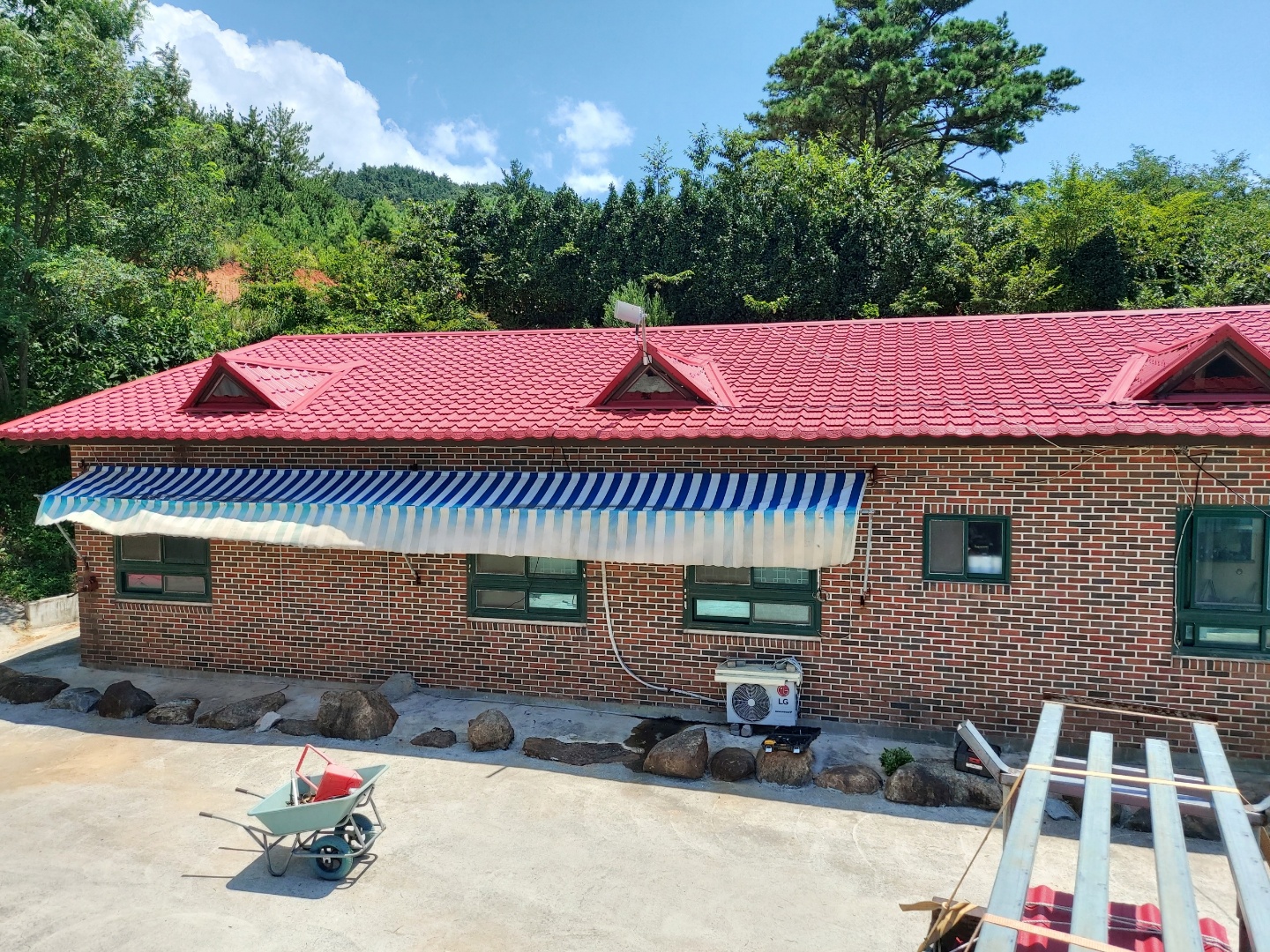 전남 고흥군 도덕면. 노후돼 비가새는 아스팔트싱글지붕을 칼라강판 평기와골로 개량함.