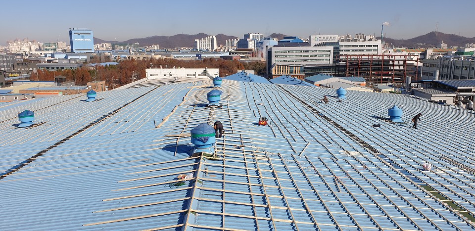 인천시 미추홀구 송림로. V250판넬의 공장지붕에 서까래와 날줄로 하지작업후 칼라강판 슬레이트골로 시공한 사례임.