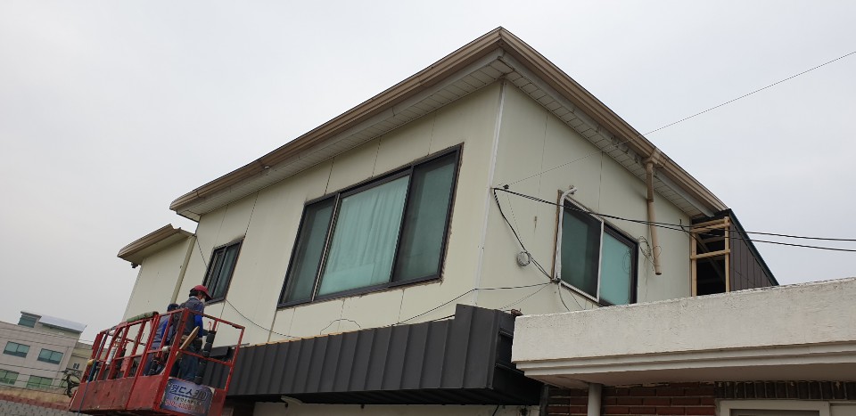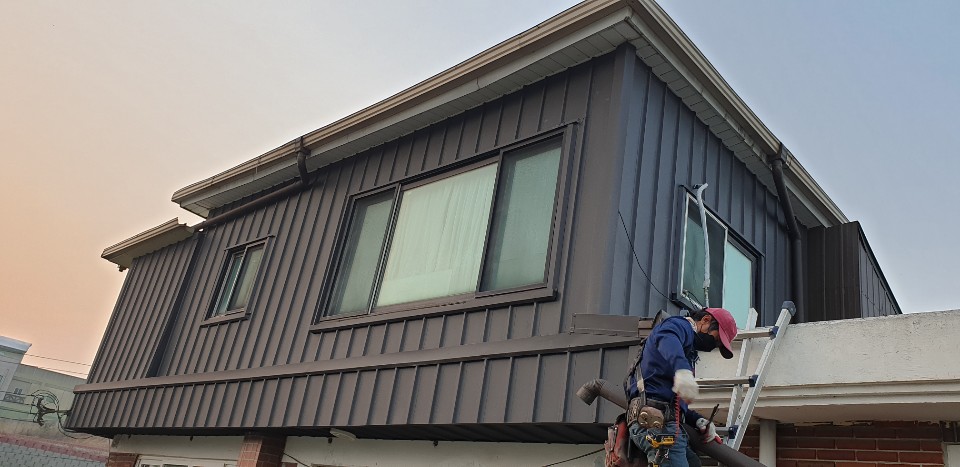 강화군 용정리. 누수로 인한 판넬외벽과 시멘트로 된 처마부분을 V250 징크로 시공함.