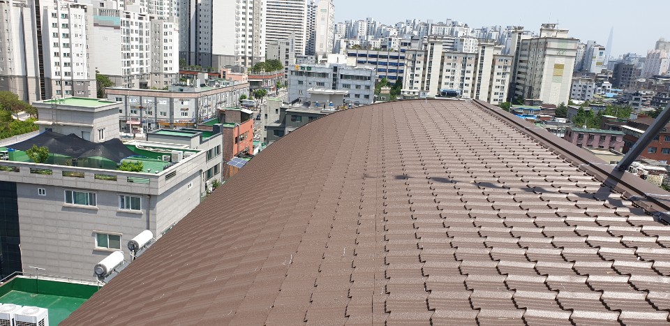 서울시 전농동. 슬레이트골 싱글지붕이 노후돼 칼라강판 평기와골로 개량공사.