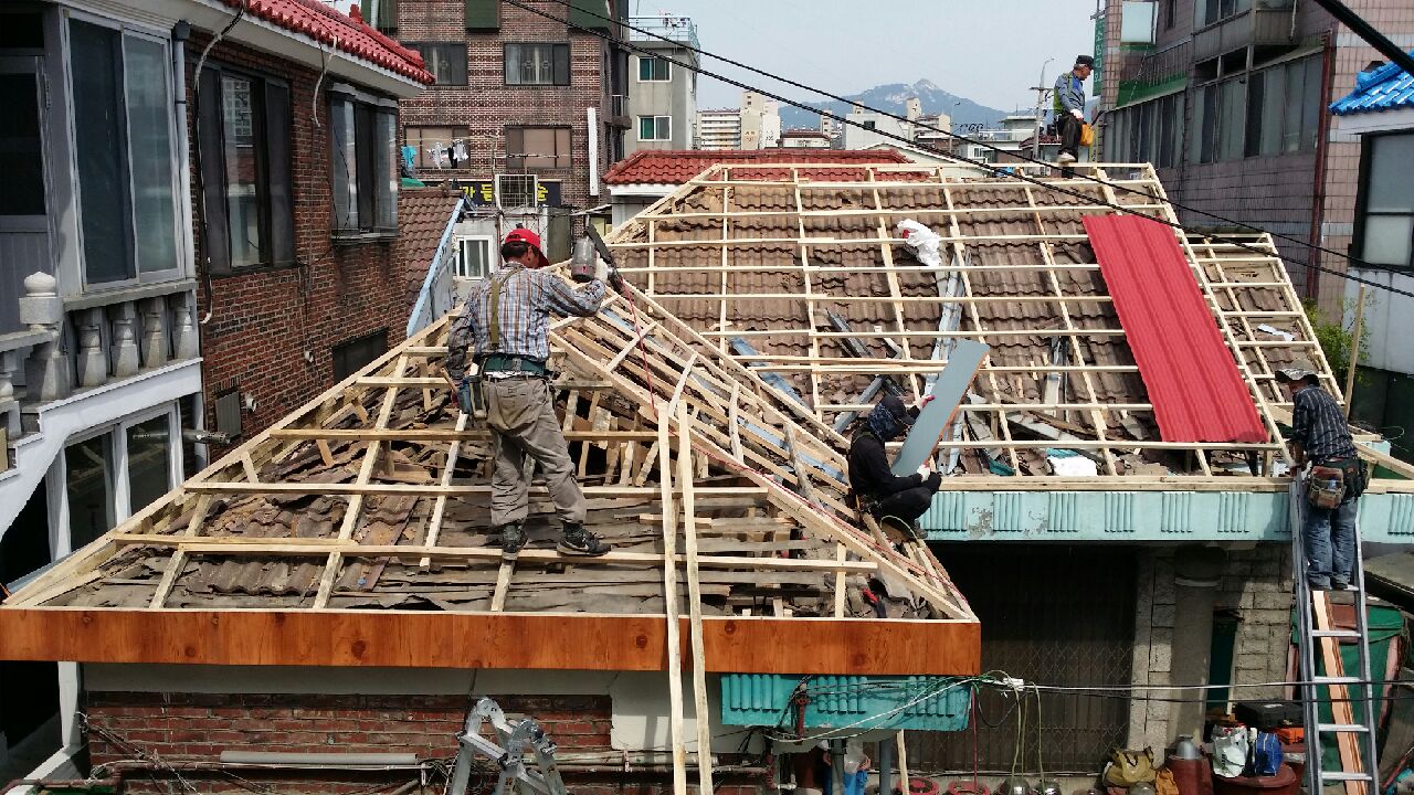 서울 도봉동에 소재한 주택으로 기존의 기와 지붕을 단열과 보온을 위해 철거하지 않고 처마부분의 기와 초장만 걷어내고 기존 기와지붕위에 투바이와 정재로 꼼꼼하게 새로운 지붕틀을 만들어 포스코 칼라강판으로 시공한 사례입니다.